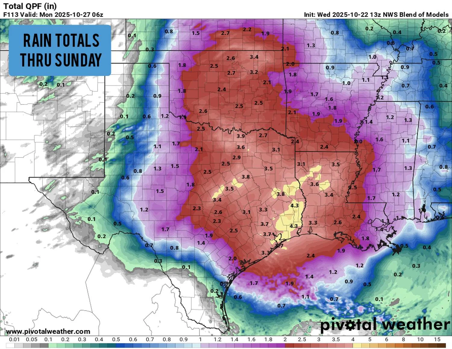 Im Verlauf der Nacht wird erwartet, dass die Stürme nach Süden und Osten in Richtung Austin und San Antonio ziehen. Während das Risiko für großen Hagel gering sein mag, lässt sich die Gefahr von heftigen Regenschauern nicht ignorieren, was für weite Teile des Bundesstaates einen erhöhten Überschwemmungsrisiko bedeutet. Das Gebiet, das San Antonio, Austin, das Hill Country, Waco und DFW umfasst, befindet sich von Freitagabend bis Samstagmorgen unter einem Risiko von 2 auf 4 für übermäßige Niederschläge. Dies entspricht einer realen Wahrscheinlichkeitsrate von mindestens 15 % für plötzlich auftretende Überschwemmungen in einem Umkreis von 40 Kilometern um jeden beliebigen Punkt in der Region.